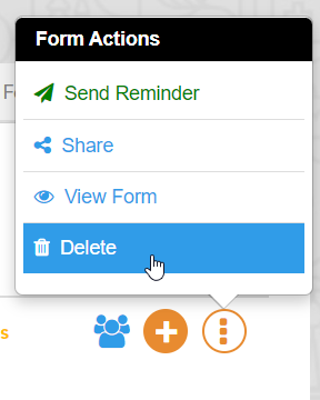 - Step 2 - Locate the form you would like to delete and click the three-dotted icon to open the Form Actions menu. Click ‘Delete Form’ to view the form. You will be asked if you are sure you would like to delete the form, clicking again will confirm deletion and remove the form.