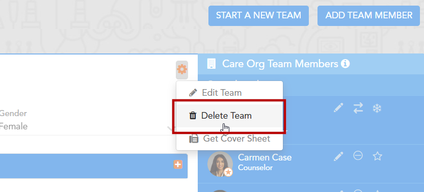 To delete a team, select that team either from the Team Selector or from the Teams module.