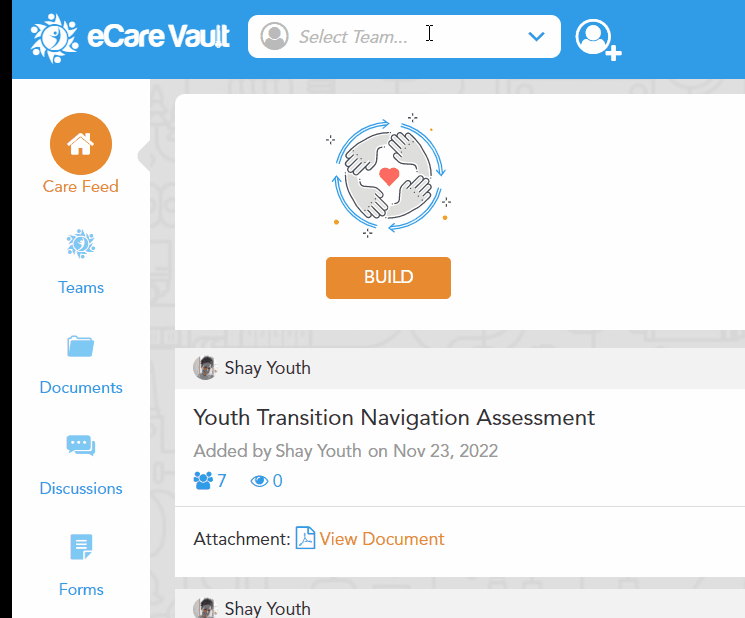 You may now perform all other available actions within eCare Vault on the team you've selected, such as uploading documents to that team, starting a discussion, creating a form or assigning a service.