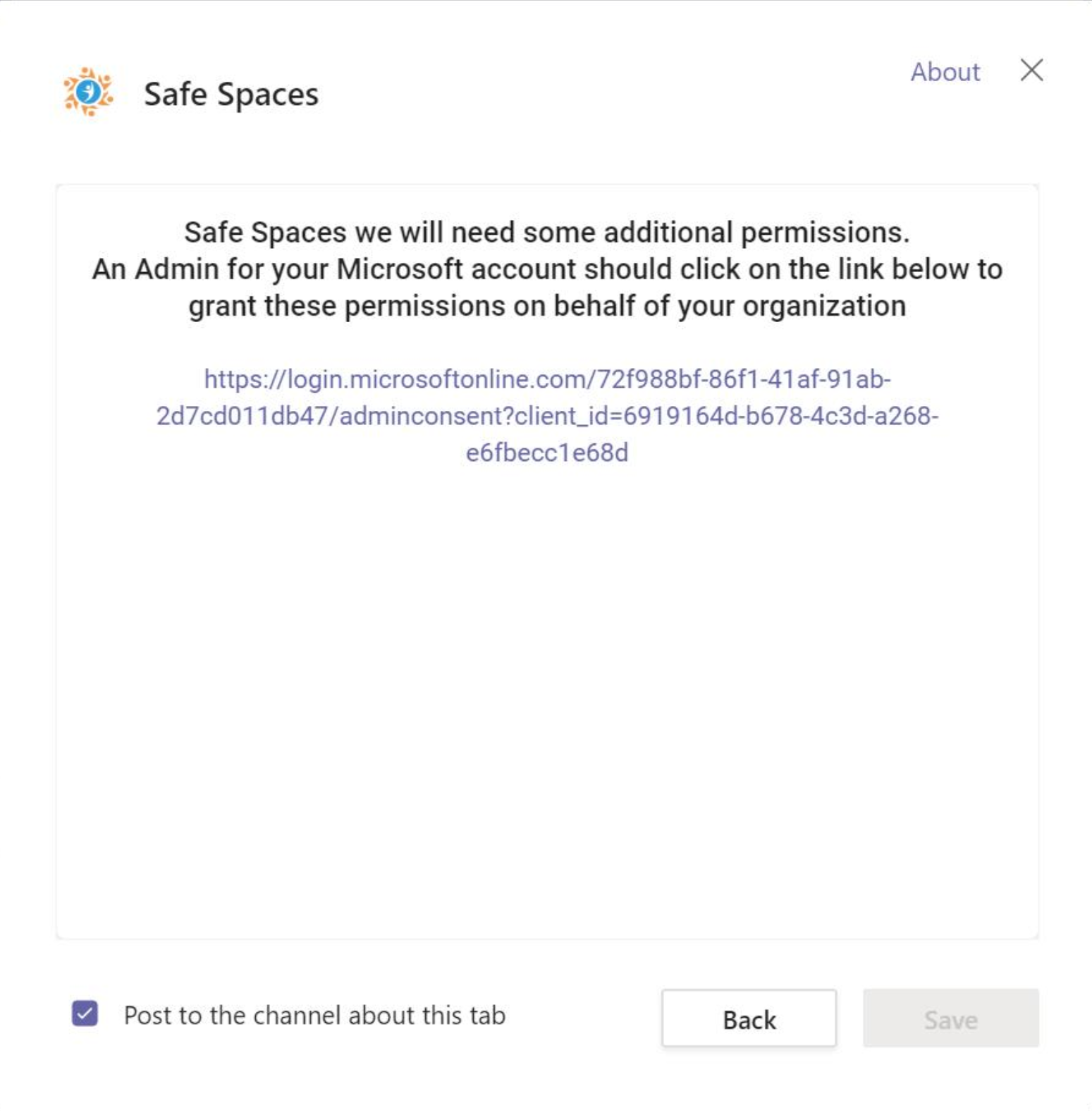 Click the link provided in the popup to grant consent on behalf of Safe Spaces for your tenant.