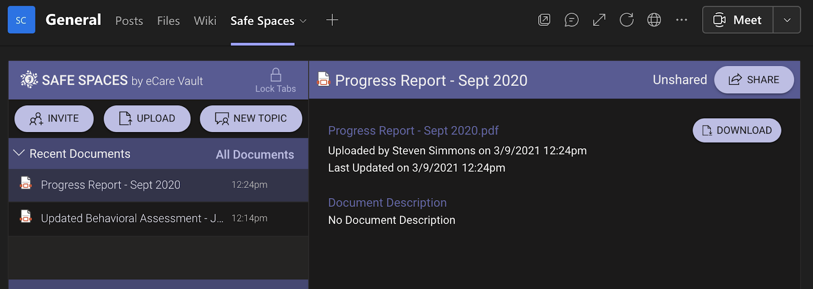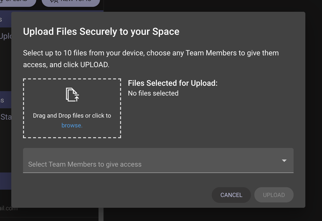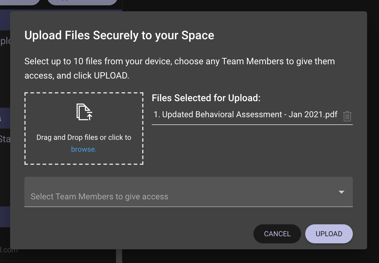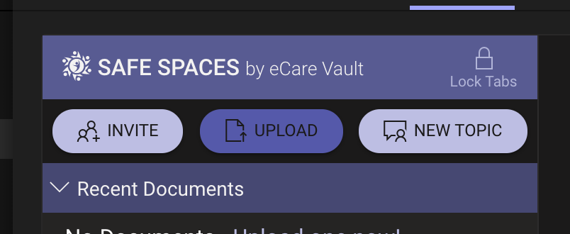 To securely upload and share a document in Safe Spaces, select the ‘Upload’ button at the top tab of the Safe Spaces environment.