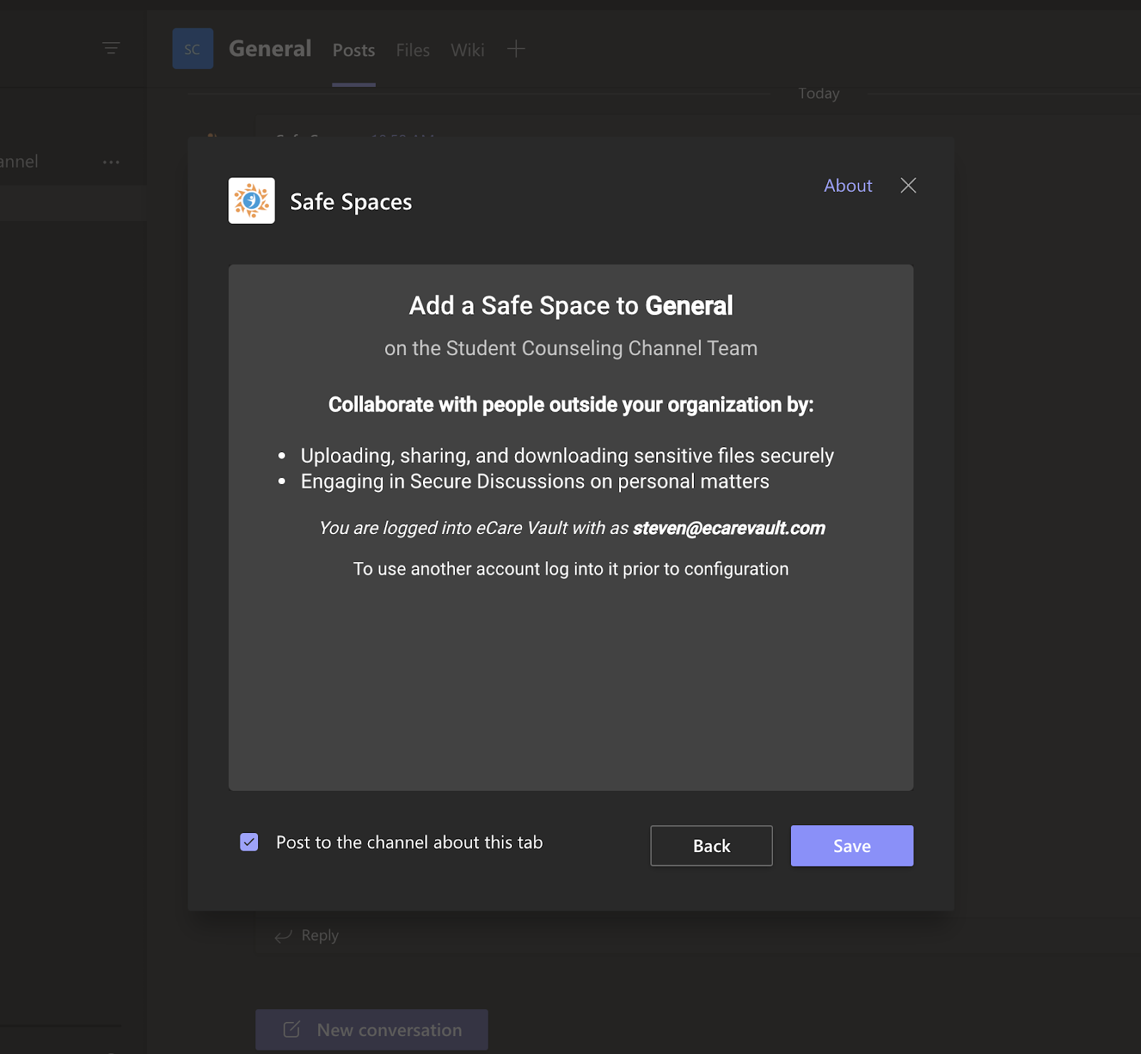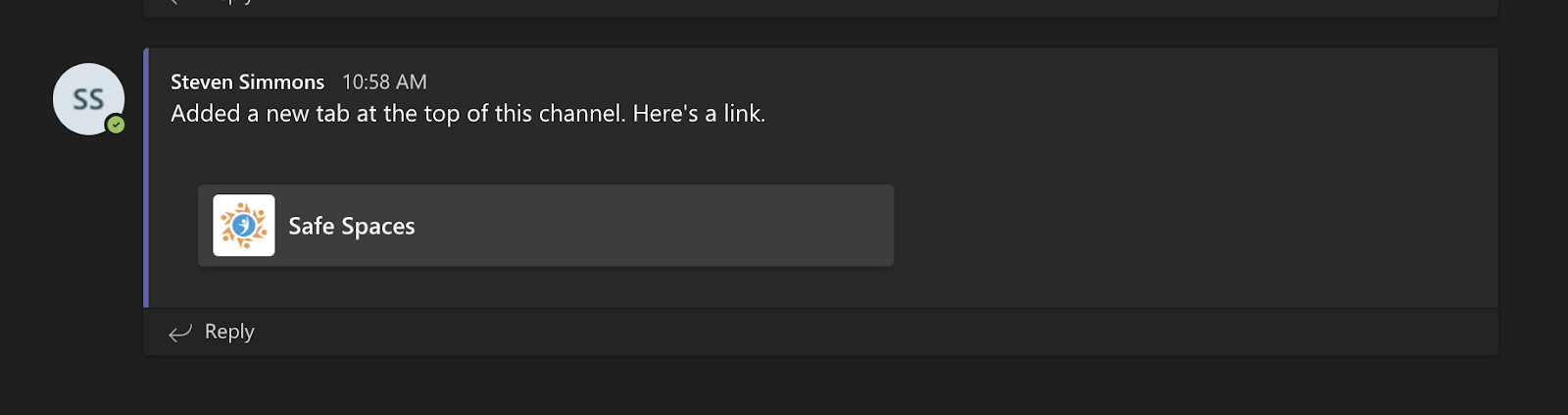 Your channel will receive a notification that you have successfully added Safe Spaces to the channel in Teams