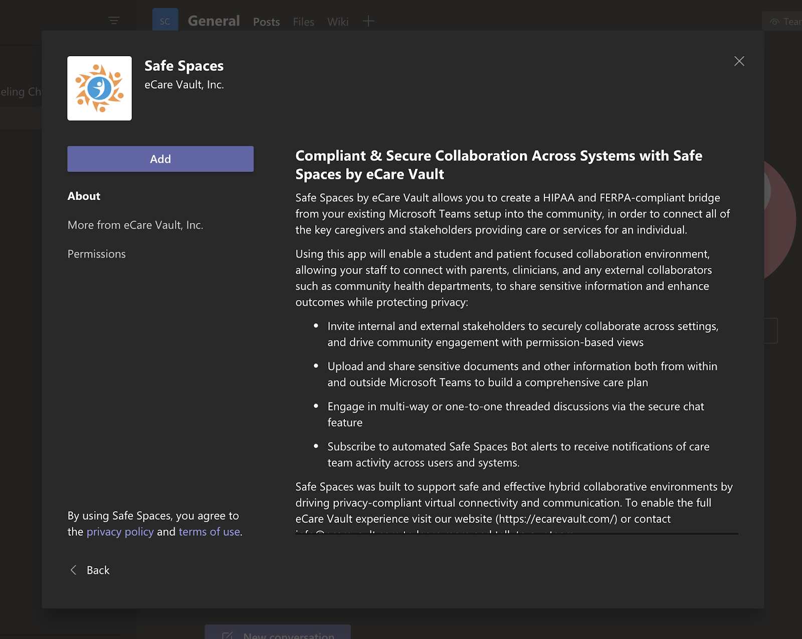 Click on the Safe Spaces icon, review the application information, and select the ‘Add’ button to activate the installation process.